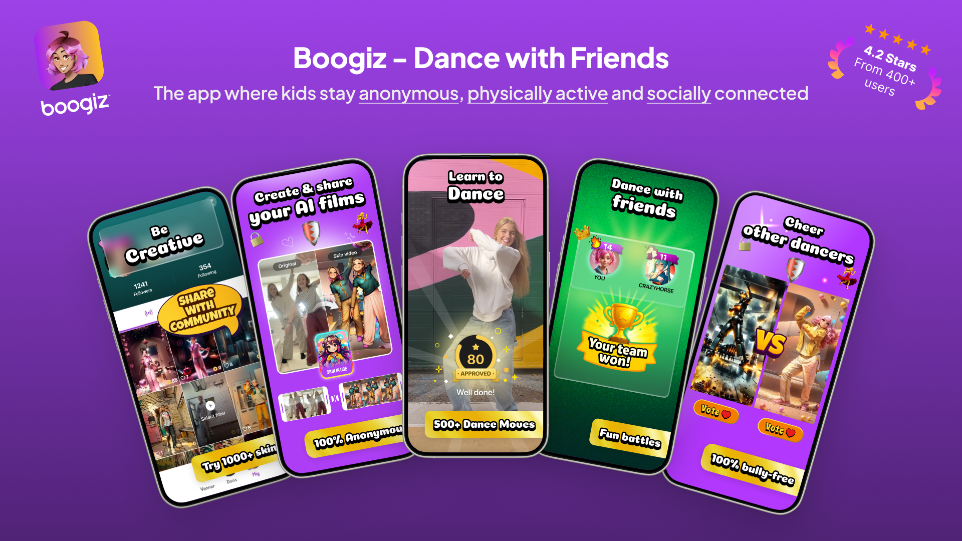 Boogiz er udviklet af professionelle dansere og er 100 % mobbefrit og anonymiserende.